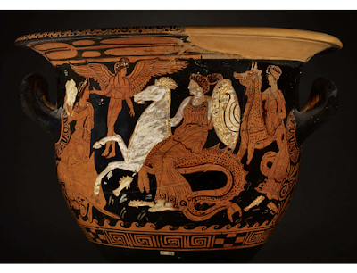 While I was at the British Museum in 2016, I also photographed this beautiful bronze handle that is said to depict a nereid mounted on a hippocamp carrying Achilles' cuirass across the sea. Since I have seen a number of Roman frescoes depicting Hephaestus showing Achilles' armor to Thetis, his nereid mother, I wondered why the museum did not identify this piece as depicting Thetis.